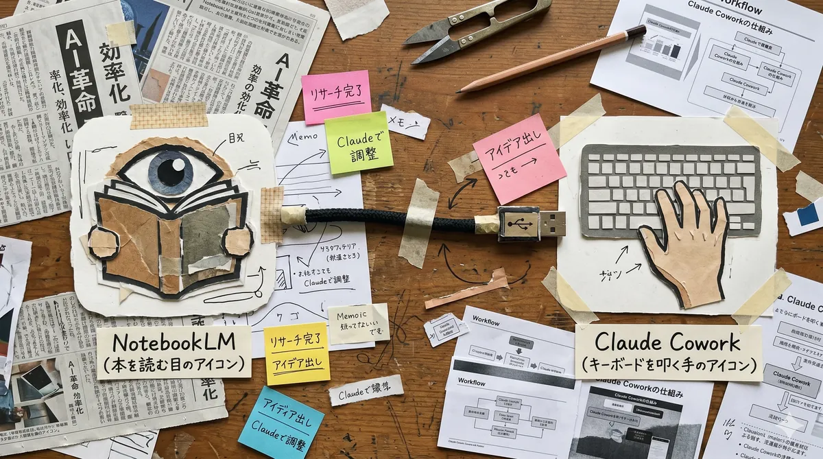 PICKUPClaude Cowork × NotebookLM2つのAIを繋げて作業を全自動化「調べる→まとめる→資料を作る」をMCP接続で一気通貫Claude CoworkNotebookLMMCP接続 Claude Cowork(パソコン操作AI)とNotebookLM(文書読み込みAI)をMCPで繋げると、「調べる→まとめる→資料を作る」が全自動になる。 NotebookLMが知識を溜めて、Claude Coworkが手を動かす。お互いの弱点を補い合う組み合わせ。 Claude Pro(月20ドル ...