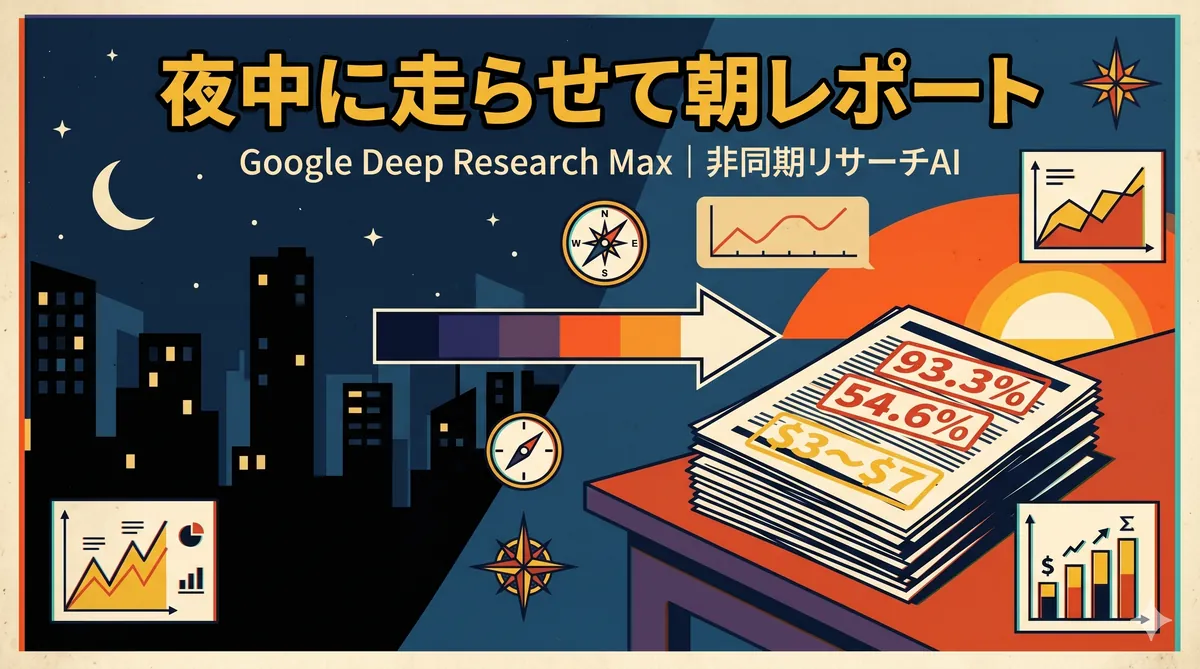 この記事の結論(3行) Google Deep Research Maxは「夜中に走らせて朝レポートが置いてある」用途に振り切った非同期リサーチAIで、Gemini API経由でしか叩けない。 DeepSearchQA 93.3%・HLE 54.6%と数字は強いが、料金は「preview rates基準・変更予定」と公式が明言しており、1レポートあたり$3〜$7が目安。 Gemini App内蔵の旧Deep Research(無料月5回)とは完全に別物。中小の企画・マーケ層は「旧版で十分な案件」と「Max ...