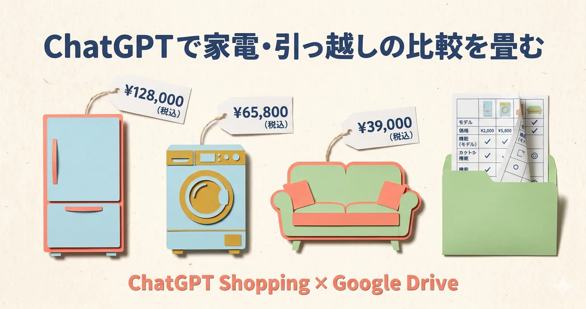 この記事の結論(3行) OpenAIは2026年3月24日、ChatGPTの買い物体験を「その場で買う」から「画像で探して表で比較」へ公式に舵を切った(出典: OpenAI公式)。 画像検索・Shopping Research・Google Drive連携を一本の動線で繋ぐと、引っ越しや家電買い替えの比較疲れを大きく短縮できる構成になっている。 ただしGoogle DriveのWrite Actions(Sheets自動書き込み)は個人Plusでは制限あり。Amazon.co.jpは非対応。ここを踏まえれ ...