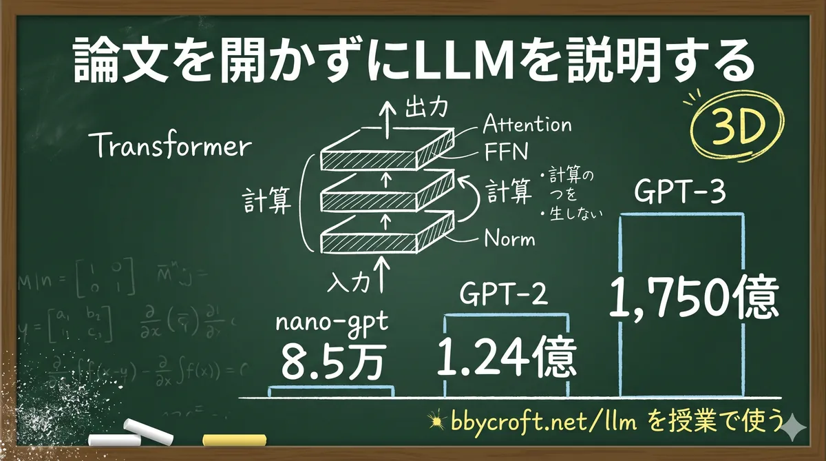 この記事でわかること bbycroft.net/llm が「論文を開かずにLLMの中身を他人に説明する」教材として機能する理由 nano-gpt(8.5万)→ GPT-2(1.24億)→ GPT-3(1,750億)のスケール差を3Dで体感できる構造 Andrej Karpathy が2025年2月の「Deep Dive into LLMs」動画でリソースに採用した事実 教育現場・社内研修・家族への説明に使うときの「どこを開いて何を見せるか」 「AIってどう動いてるの」と子どもや上司に聞かれて、論文のPDF ...