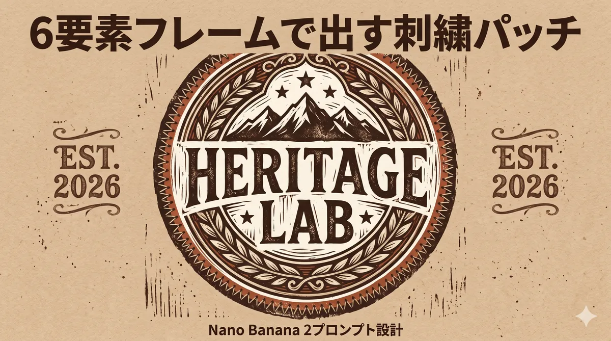 Nano Banana 2でヘリテージ風ブランドパッチを出す|公式ガイドから組み立てた6要素プロンプトフレーム この記事の結論 Nano Banana 2のテキスト精度は、Google公式が「sharp, legible text」と明記する水準に到達。 公式プロンプトガイドの5要素フレーム+海外作例の素材指定を組み替えて、ブランドパッチ専用の6要素フレームに翻案できます。 無料Geminiアプリで1日20枚まで試せて、商用は月1,200円のGoogle AI Plus以上が妥当ライン。 個人ブランドやZ ...
