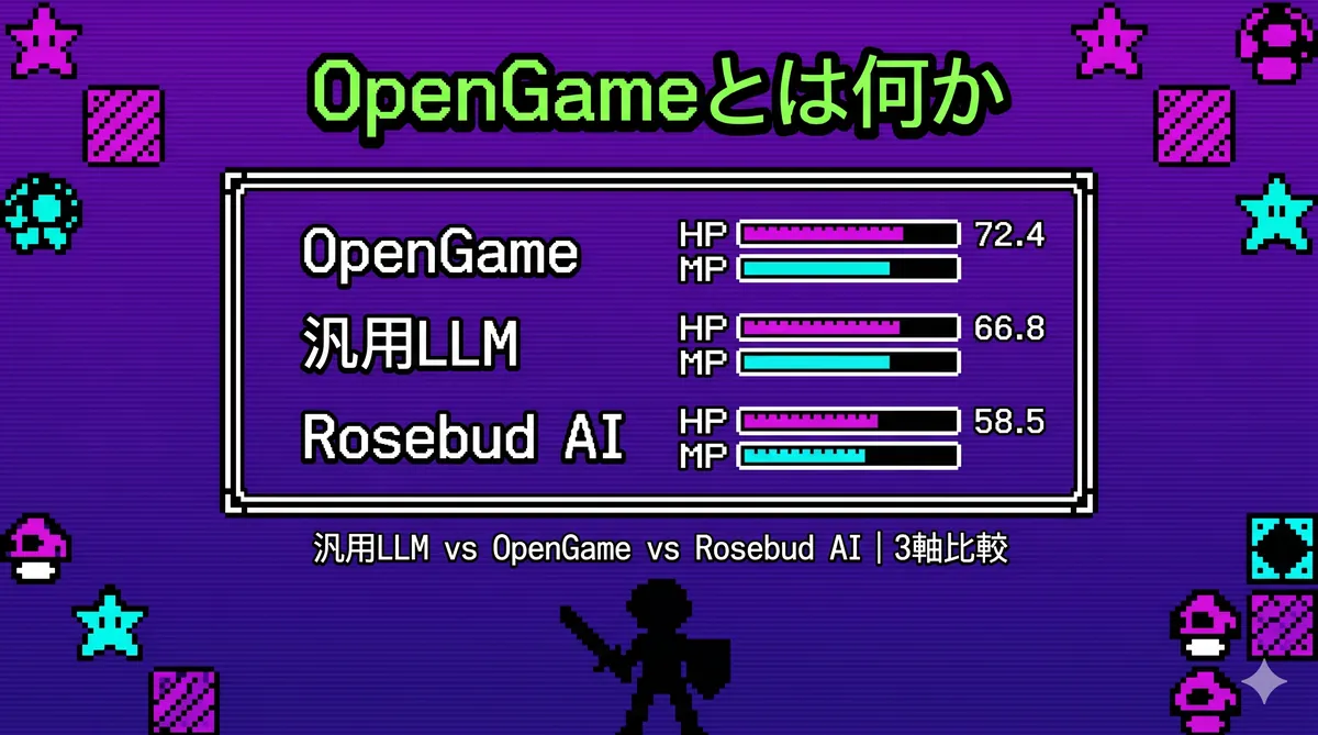この記事の要点 OpenGameは2026年4月21日に香港中文大学MMLabが公開したOSS。「汎用LLMにプロンプトで頼む」方式ではなくゲーム特化LLM(GameCoder-27B)+エージェント構成でWebゲームを丸ごと生成する 論文Table 1では、OpenGame+Claude Sonnet 4.6がBuild Health 72.4を記録。Cursor(66.8)・Claude単体(58.5)・GPT-5.1単体(57.4)を上回る 非エンジニア事業者の選択肢は「ChatGPT/Claude ...