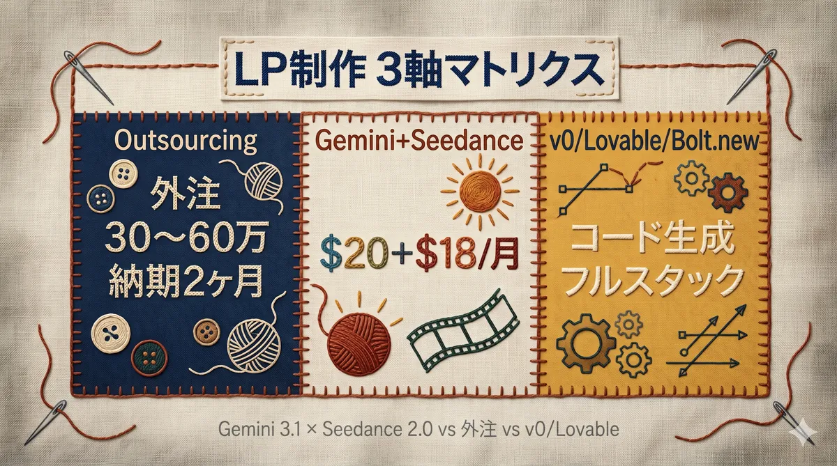 この記事の要点(30秒で読める) LP外注の相場は30〜60万、納期1〜2ヶ月、修正は2回まで無料で以降1回2万。これに毎回耐える時代は終わりつつある Gemini 3.1 Pro(月20ドル)+ Seedance 2.0(月18ドル〜)の組み合わせは、外注予算の1/100で月次運用までいける選択肢として急浮上 とはいえLP作成AIは v0 / Lovable / Bolt.new もあり、用途別に使い分けないと逆にハマる。本記事は3軸マトリクスで選定基準を出す Seedance 2.0グローバル版は20 ...