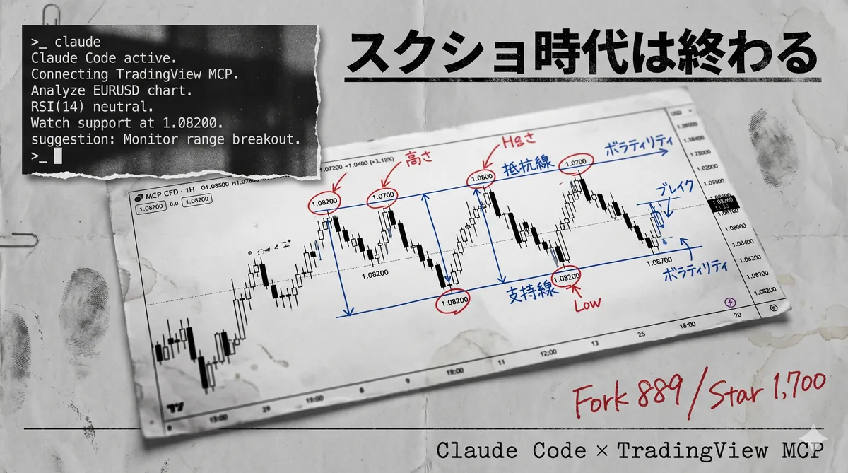 この記事の結論(3行) TradingViewのチャートをスクショしてClaudeに貼る時代は、そろそろ終わり。 tradesdontlie/tradingview-mcpはChrome DevTools Protocol経由で数値を直読みし、Claude Codeがチャートと直接話す。 Star 1,700(2026年4月20日時点)・Miles Deutscher拡散・フォーク3系統が出揃い、いま一番旬のAIトレード系MCP。 TradingViewのチャートをスクショしてClaudeに貼る運用、そろ ...