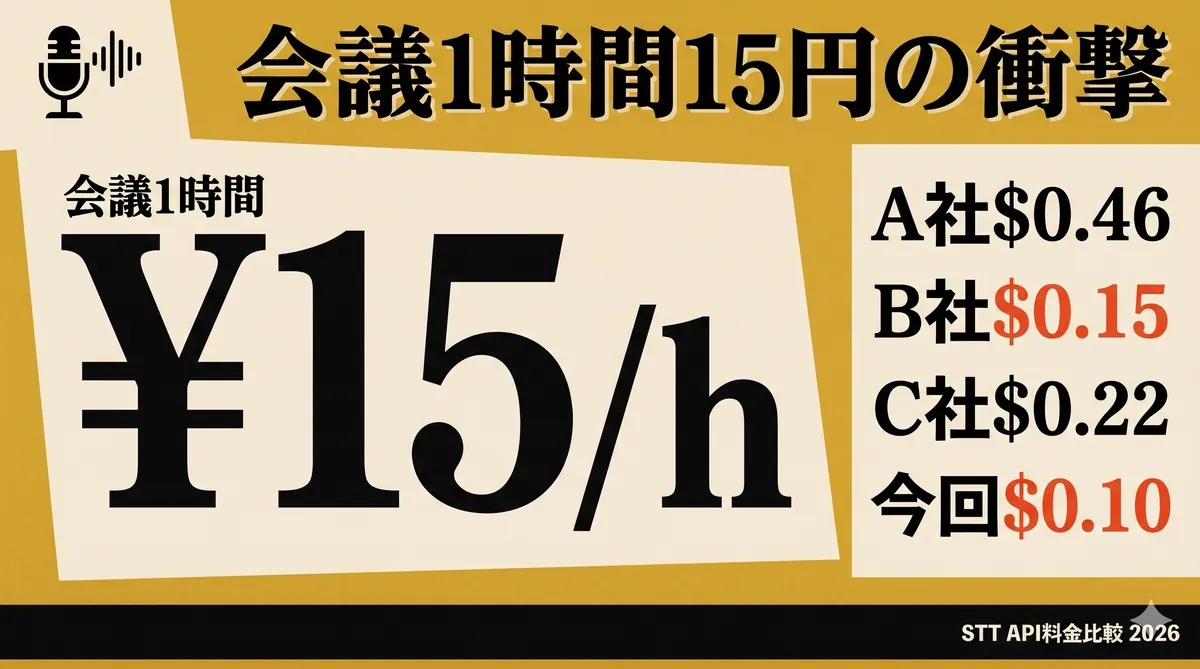 この記事の要点 xAIが2026年4月17日にGrok STT APIをGA。batch処理が$0.10/時間(日本円で約15円)、streamingが$0.20/時間。 Deepgram $0.46、AssemblyAI $0.15〜0.45、ElevenLabs $0.22と並べると、batch同士でGrokが最安クラス。会議1時間15円は料金破壊の範囲。 xAI公式ベンチマークでは電話通話エンティティ認識5.0% WERで首位を主張。ただし独立機関CodeSOTAではDeepgramが2.2%で首位 ...